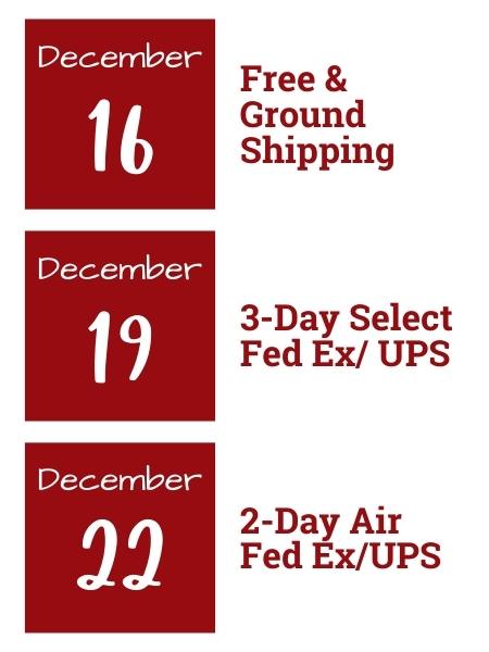 To ensure your gifts arrive by 12/24, we highly recommend ordering as early as possible to avoid any delays. These delivery dates are for Christmas eve arrival. Delivery times are dependent upon destination, weather, facility acceptance time, and other conditions.