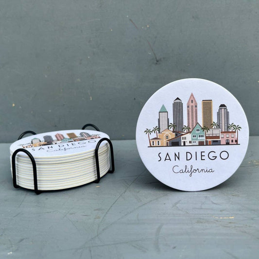 San Diego Skyline Graphic Paper Pulp Board Coasters | Set of 15 With Black Metal Stand