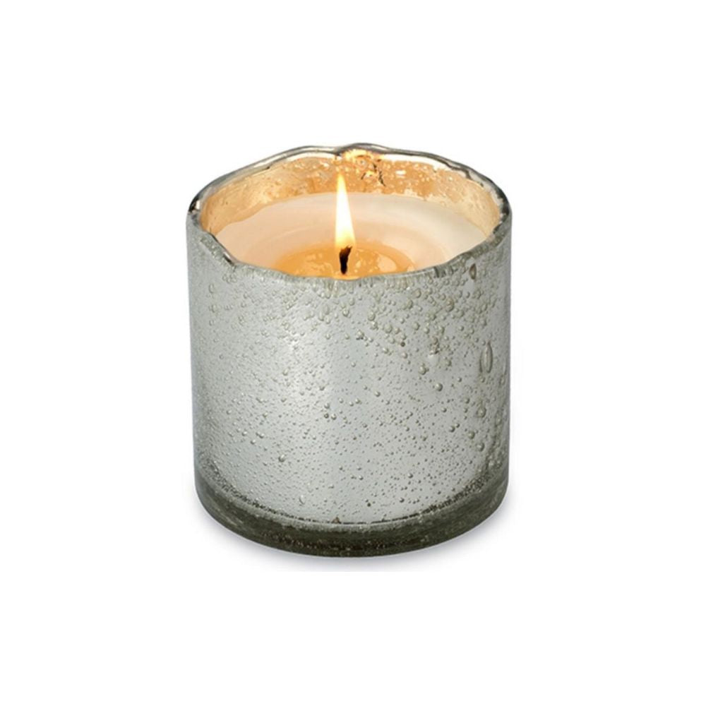 This candle, from Himalayan Trading Co., has one wick and is three inches wide by four inches tall. The grey/silver matte finish glass vessel is made of thick bubbled glass, hand-blown with an uneven rim that varies slightly in texture and finish in every piece.
