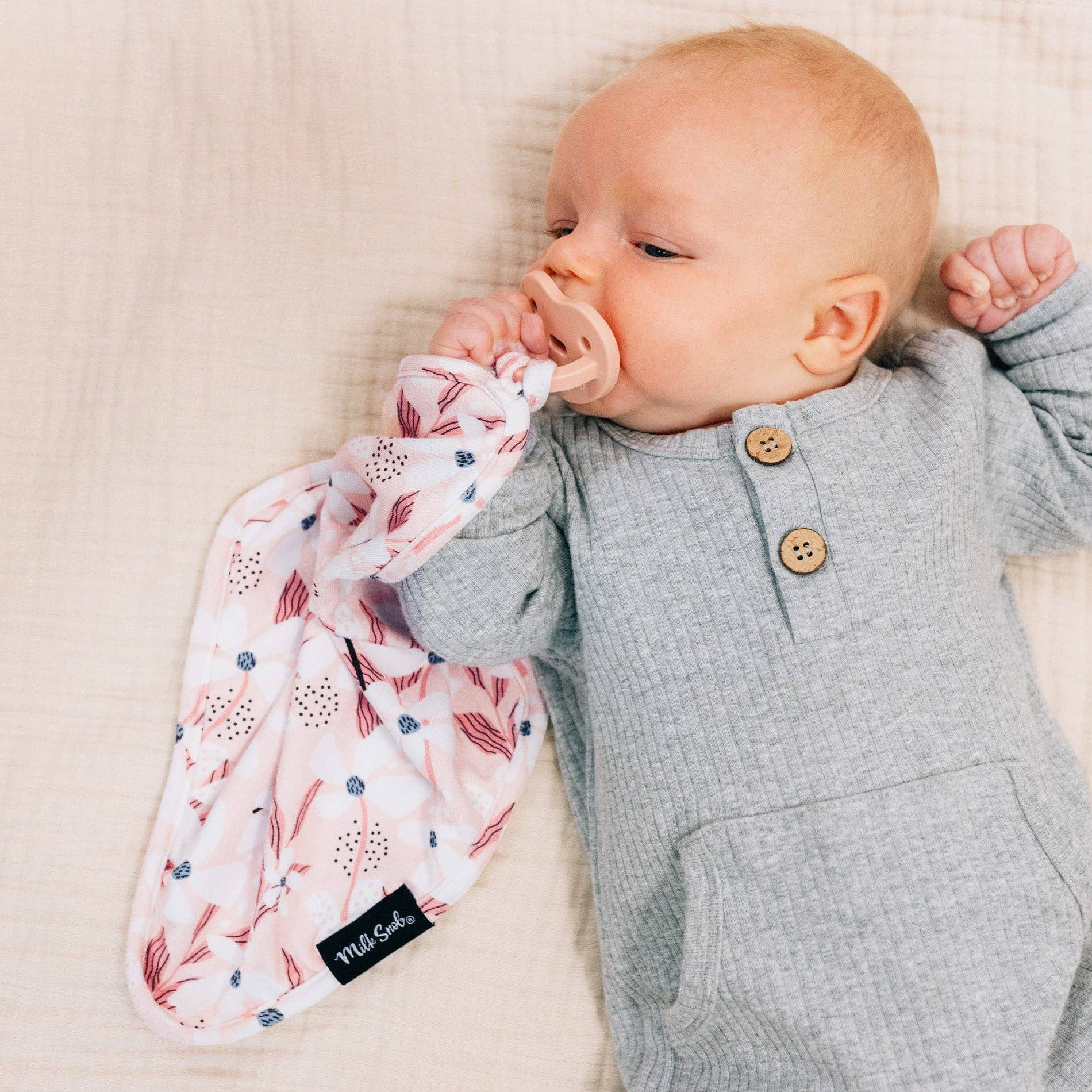 Th Blossom Milk Snob® Lovey is a mini security blanket, designed to make babies feel comforted. Attach it to a pacifier, teether, or other toy. This design features dainty flowers with a soft pink background. Pacifier not included.