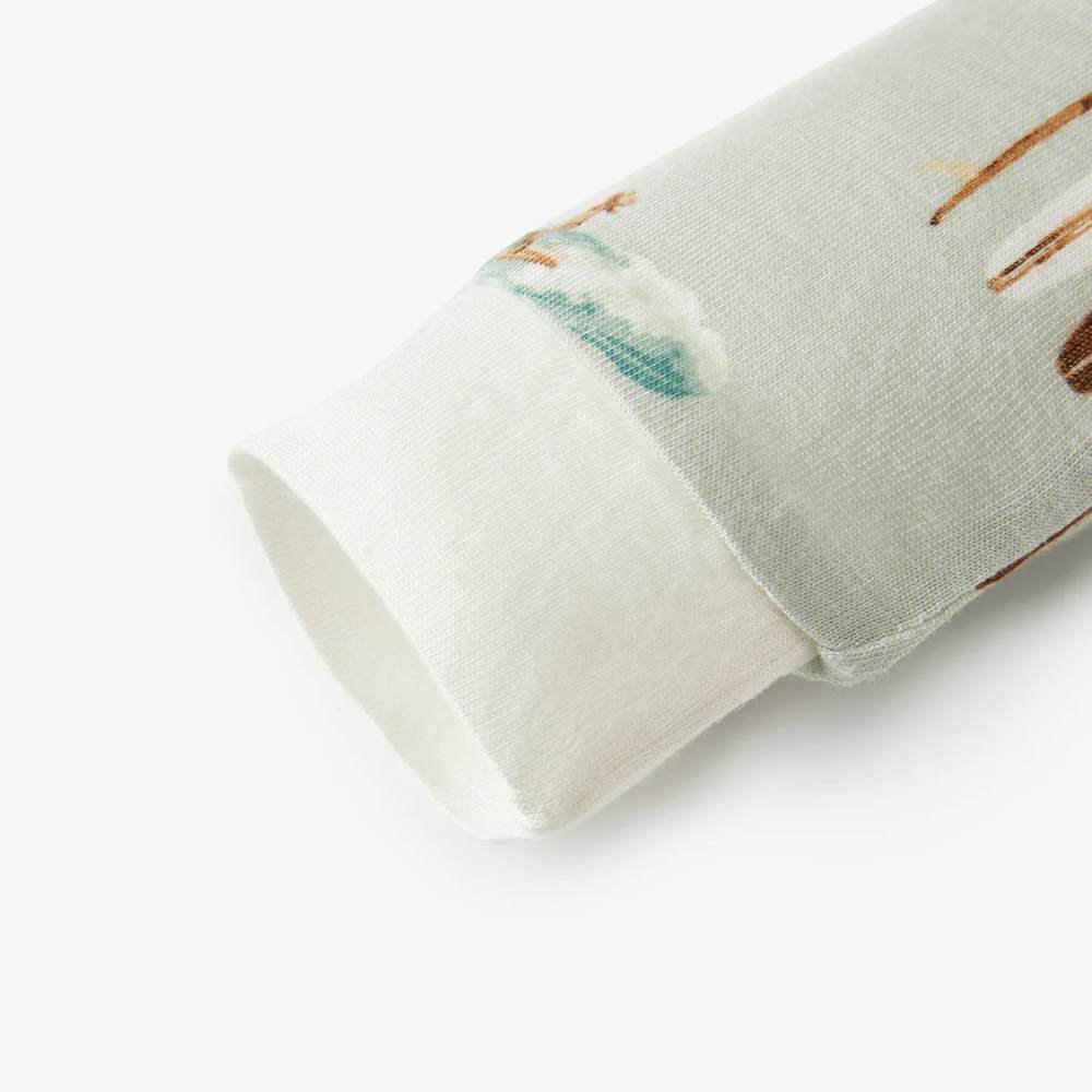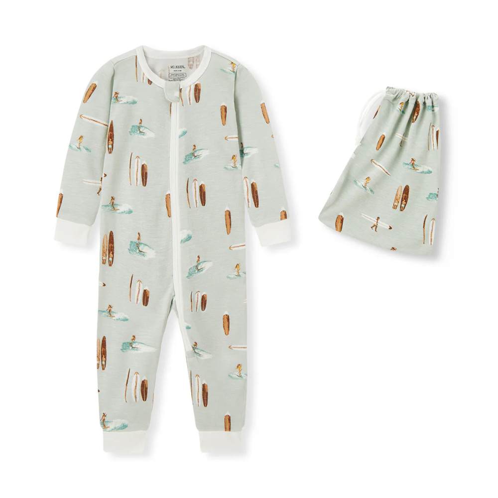 Sleep, play, and cuddle in our soft organic cotton Vintage Surf Pajama. Open foot design for mobility, midline zipper for easy changes. Includes crew neck, wide cuffs, and unique fabric zipper cover. Packaged in matching satchel for baby essentials.