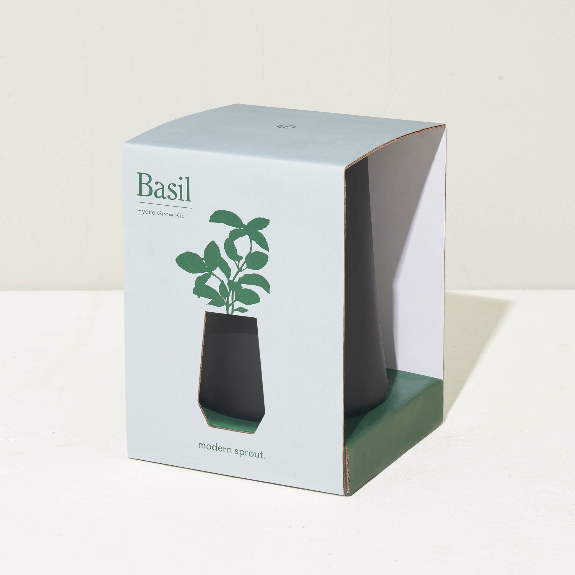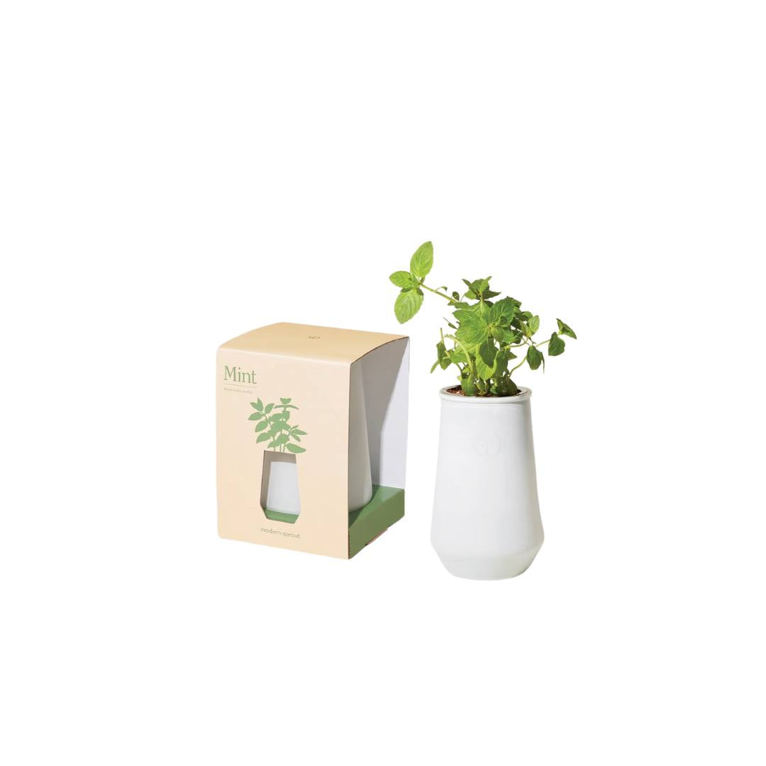 An indoor grow kit featuring a self-watering system that is outfitted in an opaque glass planter — just add water and set in a sunny window.