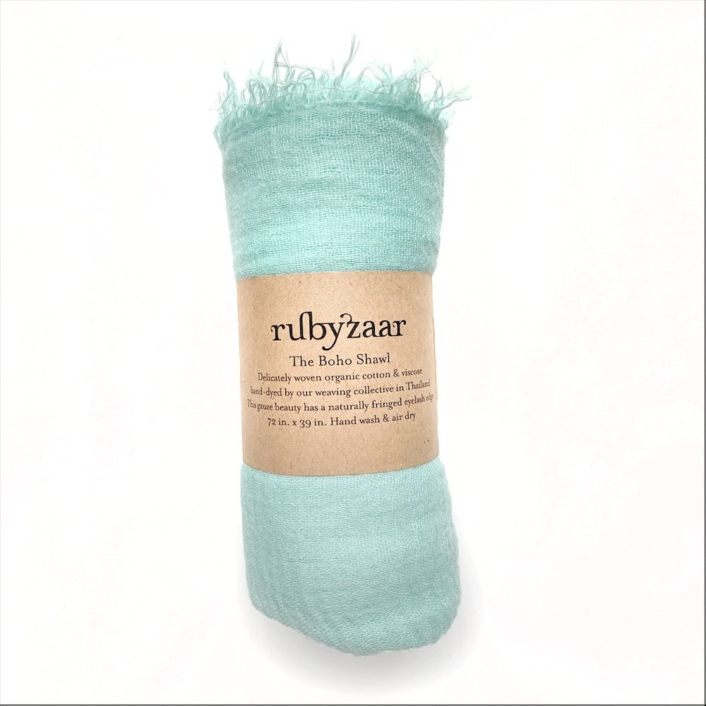 Delicately woven cotton & viscose shawl. Hand-dyed by our weaving collective in Thailand. This gauze beauty has a naturally fringed eyelash edge.