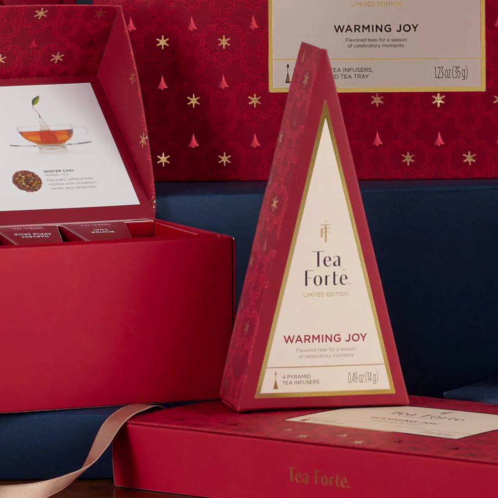 The perfect stocking stuffer or thank you gift, each limited-edition, tree-shaped box contains four Warming Joy blends in our handcrafted pyramid tea infusers including Raspberry Ganache, Rum Raisin Biscotti, Spiced Ginger Plum, and Winter Chai. All teas in this package are Kosher Certified.