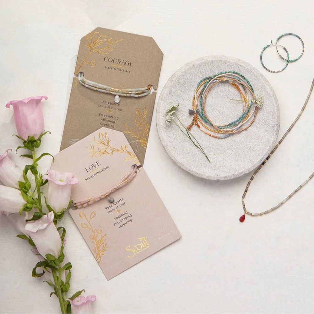 - Materials: Semi-precious gemstones, plated brass, stretch cord
