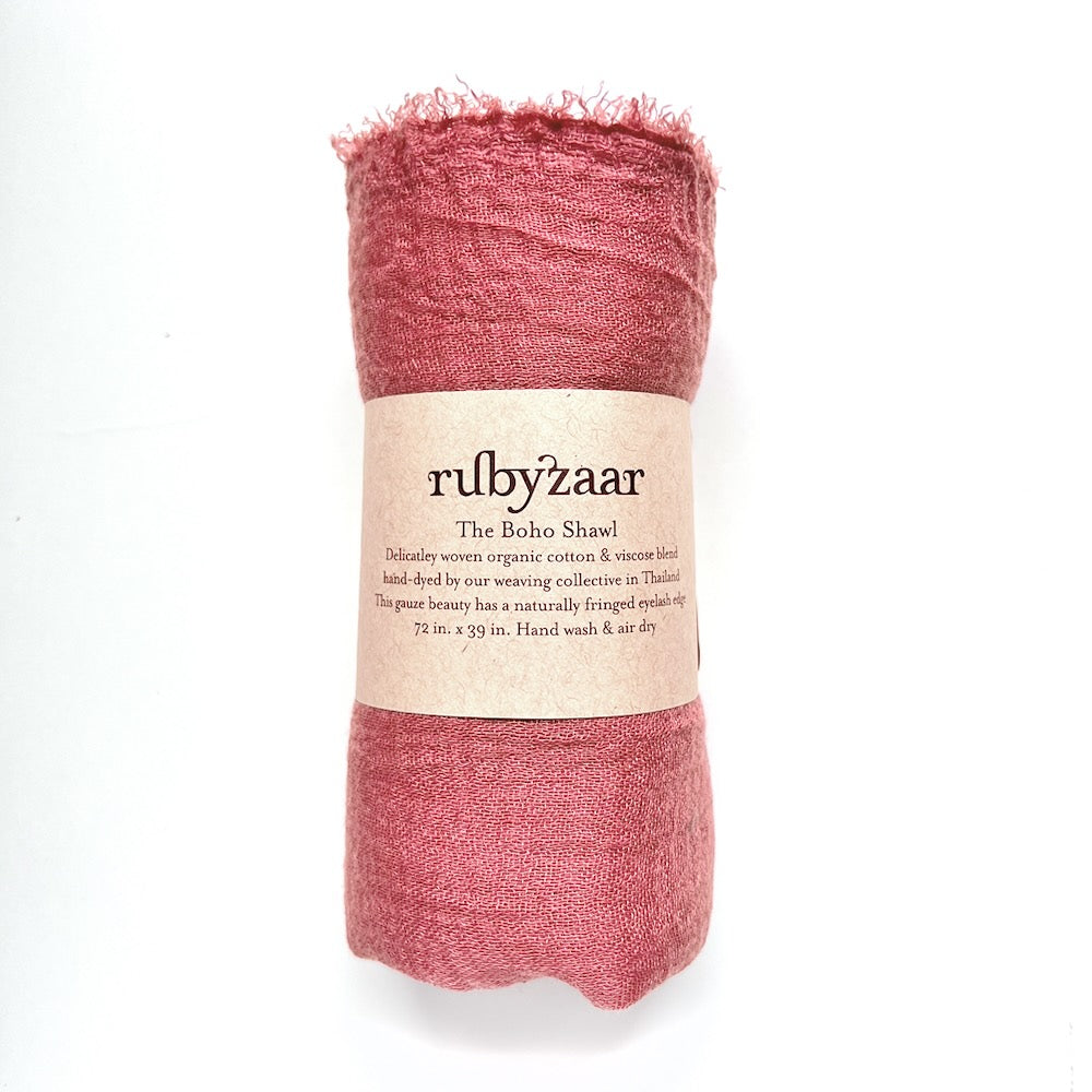 Delicately woven cotton & viscose shawl. Hand-dyed by our weaving collective in Thailand. This gauze beauty has a naturally fringed eyelash edge.